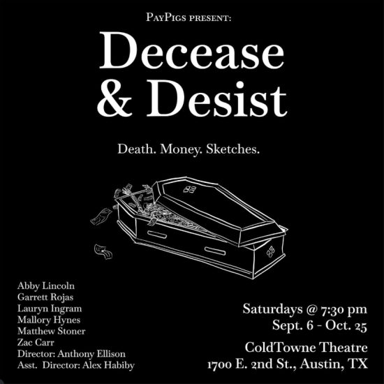 Decease and Desist is in the midst of a two-month run that kicked off Saturday, September 6th and will wrap up Saturday, October 25th. While each week’s show follows the same basic structure and content, no two performances are identical. The sketch order evolves as the team and director determine the best way to keep audiences engaged from start to finish.