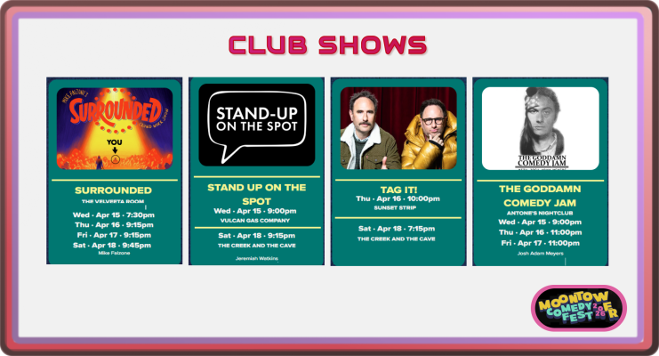 Club weekend runs April 15 – 18, and this is where Moontower’s identity really lives — over 100 comics within walking distance, intimate venues, late nights, and the kind of show you’ll be telling people about for years.