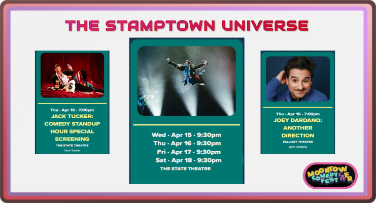 Also at Fallout: Ava Bunn’s Late Bloomers (Wednesday, April 15) — a character show format that Sam flagged as something genuinely new to the Moontower lineup. Bunn, a 2025 Just for Laughs New Face, is also about to become more widely known as a cast member in the upcoming Scrubs revival. And Joey Dardano is bringing his solo show Another Direction (Thursday, April 16) to Fallout as well — more on him in the Stamptown section.