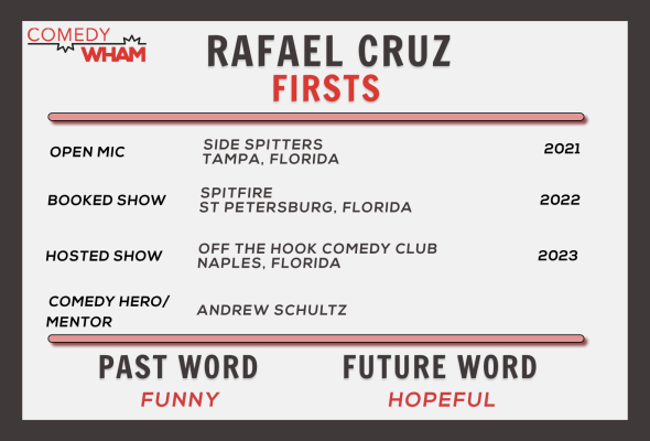 Only a few years into his own comedy career, Rafael was in Austin for just a couple of years before landing in the 2025 Cap City Comedy Club's Funniest Person in Austin contest finals. He had missed the deadline in 2024, so he's the rare star who lands in the finals on their first try. Admittedly, someone dropped out and he was next in line, but he recognized that he had pandered to the judges in an earlier round. For the finals it became more important for him to be authentic. It was a good strategy and life lesson as Cap City has since invited him to host and perform. He values the perspective he's gained from being a preschool teacher, working to rebuild his standing in a new comedy scene, and a very supportive girlfriend. While I declared that Rafael needs to become famous to wipe out existing browser search results, what's more important to him is getting better, "I just want to get good at this. And like people I respect see me and go, 'yeah, he's good.'" It's just a matter of time for our favorite Rafael Cruz.