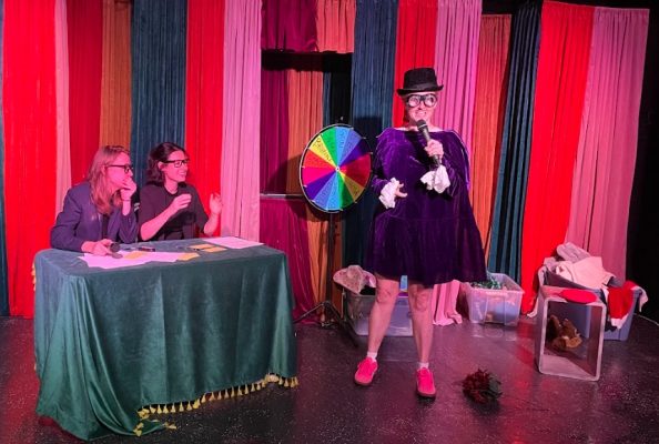 The premise is simple: three guest comics are invited on stage one at a time, each are then adorned with random costume pieces and props, and within a limited amount of time are tasked with creating a character based on the accessories given to them. Hosts Jo Foster and Brian McAughan are our local news anchors reporting weirdos on the beat, but they’re also extreme makeover artists. Each plain dressed guest is transformed before our eyes as the two frantically decide what wacky apparel mismatches best. A wheel is spun to decide the finishing touch- a prop to tie everything together. The guest is then sent backstage. They’ll return as an entirely new person.